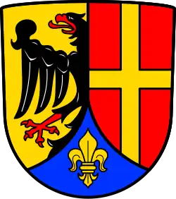 Blasonierung: „Über einer erniedrigten, geschweiften blauen Spitze, darin eine goldene heraldische Lilie, gespalten von Gold und Rot, vorne ein halber, rotbewehrter schwarzer Adler am Spalt, hinten ein durchgehendes goldenes Kreuz.“