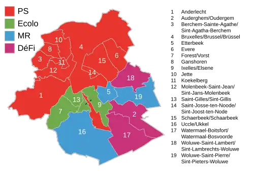 - ↑ a b c Ergebnis Parlament der Region Brüssel-Hauptstadt 26 Mai 2019. Föderaler Öffentlicher Dienst Inneres, abgerufen am 22. Juni 2024.