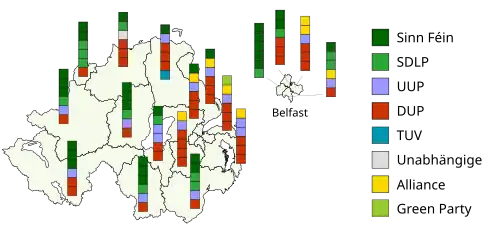 | Wahlkreis | DUP | Sinn Féin | UUP | SDLP | Alliance | Andere | Gesamt | |||||||