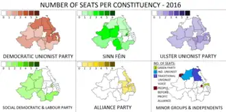 - ↑ Raymond Russell: Research and Information Service Research Paper: Election Report: Northern Ireland Assembly Election, 5 May 2016; Table 7.1 Seats by Party and Constituency: 2016 (v 2011). (PDF) Research and Information Service, Northern Ireland Assembly, 12. Mai 2016, abgerufen am 14. Mai 2016 (englisch).