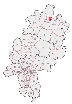 | 2023 | Wahlkreis 4 – Kassel-Stadt II[21][22] | die Ortsbezirke 1 Mitte, 2 Südstadt, 10 Rothenditmold, 11 Nord-Holland, 12 Philippinenhof-Warteberg, 13 Fasanenhof, 14 Wesertor, 15 Wolfsanger, 16 Bettenhausen, 17 Forstfeld, 18 Waldau, 19 Niederzwehren, 23 Unterneustadt der kreisfreien Stadt Kassel[23] | Maximilian Bathon | CDU | 24,2 |