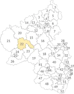 Der Wahlkreis Wittlich (Wahlkreis 22) ist ein Landtagswahlkreis in Rheinland-Pfalz. Er befindet sich im Landkreis Bernkastel-Wittlich und umfasst bis 2011 neben der verbandsfreien Stadt Wittlich die Verbandsgemeinde Wittlich-Land und die Gemeinden der ehemaligen Verbandsgemeinde Kröv-Bausendorf.[1] Zur Landtagswahl 2021 umfasst er das Gebiet der Stadt Wittlich sowie die Verbandsgemeinden Wittlich-Land und Traben-Trarbach.[2]