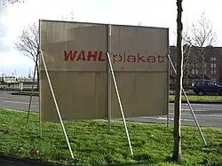 Einige Gemeinden sind dazu übergegangen, freies Plakatieren zu verbieten und im Gegenzug den Parteien Flächen wie abgebildet zur Plakatierung zur Verfügung zu stellen. Diese Ständer werden außerhalb des Wahlkampfes durch die Gemeinde abgebaut, so dass keine Störung des Ortsbildes entsteht.