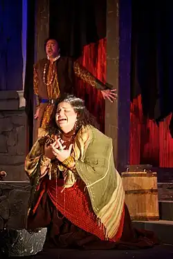 Relativ selten sind geistig zerrüttete weibliche Opernfiguren, die nicht unschuldig oder moralisch einwandfrei sind. Zu den drei bekanntesten Beispielen gehört die zwischen ihrer (unerwiderten) Liebe, Eifersucht und Rachegefühlen und ihrer starren und harten Macht-Rolle als Königin hin- und hergerissene alternde Elisabetta in Donizettis Roberto Devereux (1837),[35] die es am Ende nicht verkraftet, dass sie selber das Todesurteil über den von ihr geliebten, aber des Hochverrats angeklagten Titelhelden unterzeichnet hat. Hochgradig schuldig ist die durch und durch böse und machtgierige, aber später von Gewissensbissen über die von ihr verschuldeten Morde geplagte Lady Macbeth in Verdis Macbeth (1847),[38] deren psychologisch sehr einfühlsam gestaltete, mit beinahe erstickter Stimme vorzutragende „Nachtwandelszene“ mit ihrer wirksamen Instrumentierung eine der beeindruckendsten Wahnsinnsdarstellungen überhaupt ist und sich deutlich von den schönen Kantilenen der unschuldigen Heroinen unterscheidet. Eine merkwürdige, aber realistisch wirkende Mittelstellung hat die unbestreitbar schwer traumatisierte, seelisch fragile und immer wieder halluzinierende Zigeunerin Azucena in Verdis Il trovatore (1853), die während der Verbrennung ihrer Mutter auf einem Scheiterhaufen in wahnsinniger Verzweiflung und geistiger Umnachtung ihr eigenes Kind durch eine Verwechslung ermordete und von den Erinnerungen ihr Leben lang heimgesucht wird.[40][41] Azucena ist auch darin ungewöhnlich, dass sie nicht mehr ganz jung, sondern eine ältere Frau ist, die wahrscheinlich auch deshalb (und weil sie nicht ganz schuldlos ist) für einen Mezzosopran komponiert ist.