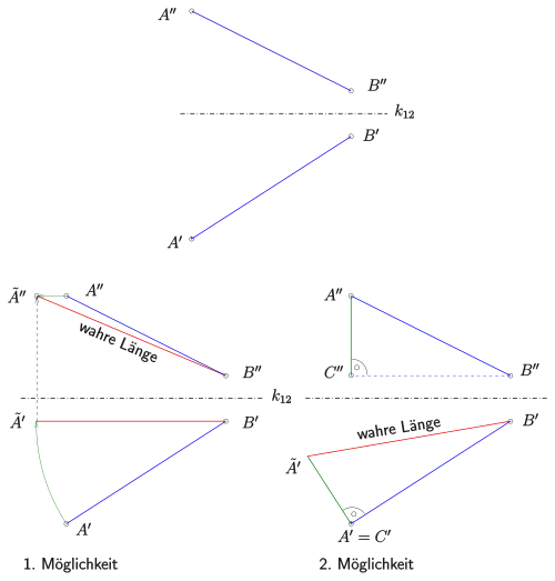 - Man drehe das rechtwinklige Dreieck um die Kathete um parallel zur Grundrisstafel, indem man in senkrecht die Strecke anträgt. Die Länge der Hypotenuse des entstandenen (rechtwinkligen) Dreiecks ist die wahre Länge.