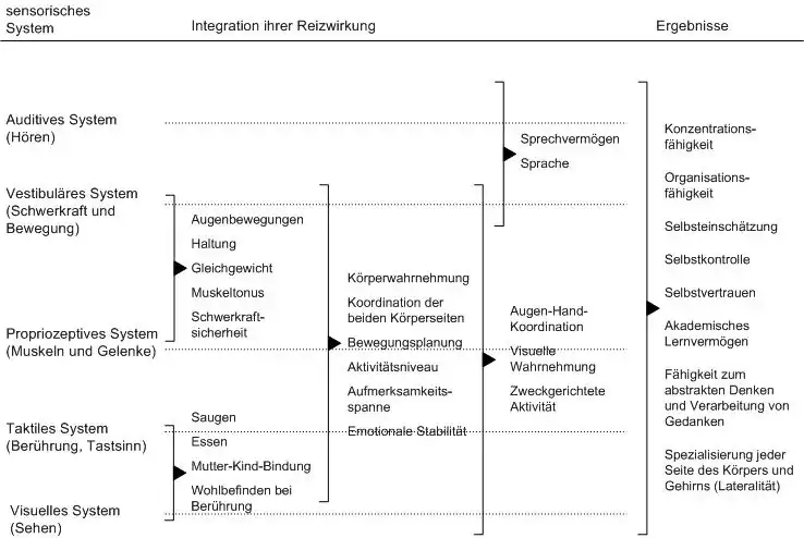 Wichtiger allerdings sind die Annahmen, die Anna Jean Ayres 1984 dann zur weiteren Entwicklung der sensorischen Integration gemacht hat: Diese führen zum Aufbau komplexer Systeme, sogenannter höherer Hirnfunktionen, die ein koordiniertes Verhalten und schließlich ein zielgeleitetes und systematisches Handeln erst möglich machen.