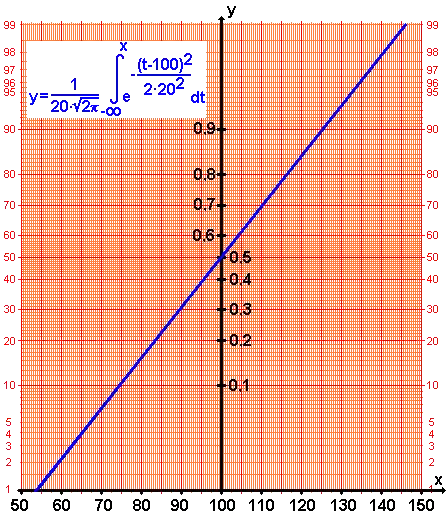 Als Beispiel ist nachfolgend die Funktion für den Erwartungswert μ = 100 und die Standardabweichung σ = 20 auf Wahrscheinlichkeitspapier gezeichnet.