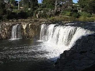 Rund 3,5 km vor dem Mündungsgebiet des Flusses und direkt nördlich der kleinen Siedlung Haruru befinden sich die Haruru Falls, die den Waitangi River rund 5 m unter dem Meeresspiegel in die Tiefe stürzen lassen.[1]