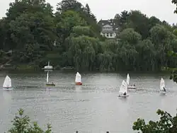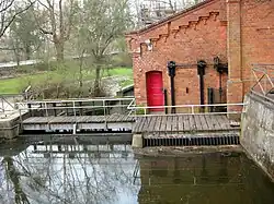 ![]() Ende der Wakenitz am Falkendamm in Lübeck – am linken Bildrand ist der Überlauf zum Elbe-Lübeck-Kanal sichtbar | ||