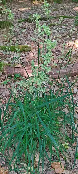 Die Blütezeit reicht von Juni bis September. Der rispige Blütenstand ist 6 bis 12 Zentimeter lang, schlaff und meist nickend und nur während der Anthese weit ausgebreitet.[3] Die Seitenäste der Rispe gehen einzeln von der rauen Hauptachse ab.[3] Die unteren Seitenäste sind nur im obersten Teil verzweigt und locker mit Ährchen besetzt.[3] Die Ährchen sind drei- bis vierblütig und 5 bis 8 Millimeter lang.[3] Die beiden Hüllspelzen sind fast gleich, sie sind gekielt, kahl, aber auf dem Mittelnerv kurz bewimpert und 3 bis 5 Millimeter lang.[3] Die Deckspelze ist kahl und nur auf dem Mittelnerv in der oberen Hälfte kurz und fein bewimpert; sie ist spitz oder schmal-abgerundet und ihr Mittelnerv läuft in eine kurze Grannenspitze aus. Sie ist 4 bis 7 Millimeter lang.[3] Die Vorspelzen sind zweinervig und etwa 0,5 Millimeter kürzer als die Deckspelzen.[3] Die Staubbeutel sind 1,5 bis 2 Millimeter lang.[3]