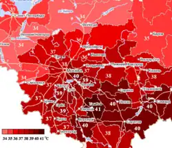 Präsident Medwedew verhängte deshalb über sieben Regionen den Notstand.[4] Über die Zahlen der Verletzten und jener, die durch das Feuer obdachlos wurden, kann nur spekuliert werden. Es waren zeitweise über 240.000 zivile Rettungskräfte und über 2.000 Armee-Angehörige sowie 54 Löschflugzeuge im Einsatz. Durch die Waldbrände war zwischenzeitlich auch ein Atomforschungszentrum bei der Stadt Sarow ca. 400 km südöstlich von Moskau bedroht.[5][6] Des Weiteren wüteten große Torffeuer in den Moorlandschaften um Moskau, was die Lage zusätzlich verschärft hatte. In weiten Teilen Russlands herrschte von Ende Juni bis Mitte August 2010 die größte Hitze seit Beginn der Wetteraufzeichnungen vor 130 Jahren. So wurden am 2. August in der Stadt Woronesch 44 Grad Celsius gemessen.[7] Die schnelle Ausbreitung der Brände wurde durch den vertrockneten torfigen Untergrund begünstigt.[8] Anfang August war Rjasan am stärksten betroffen, doch am 9. August wurden im Autonomen Kreis der Chanten und Mansen 75 Brände registriert, womit es weit vor Rjasan (38) und Moskau (28) lag.[9] Die Auswertung von Bildern der NASA-Satelliten Aqua und Terra ergaben eine Reduzierung von 564 auf 442 Brände am 9. August 2010.[10] Am 14. August 2010 wurden noch 368 Wald- und Torfbrände in Russland registriert.[11]