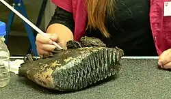 Etwa 300.000 Jahre alte Reste des Europäischen Waldelefanten wurden schon in den 1990er Jahren im Tagebau Schöningen an der Fundstelle Schöningen 12 gefunden, darunter einzelne Stoßzähne und Stoßzahnlamellen.[13][14] Der gleiche Fundbereich barg auch fast zwei Dutzend Reste des Europäischen Waldelefanten von wenigstens drei Individuen, die zwischen 2008 und 2009 ausgegraben wurden. Dazu gehört auch die Spitze eines Stoßzahns. Sie weist Polierungsspuren auf und diente möglicherweise als Werkzeug.[15]