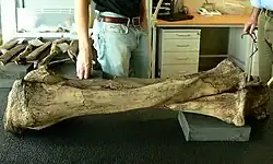 Bedeutende Funde kamen auch im Geiseltal, ebenfalls Sachsen-Anhalt, zu Tage. Dort fanden sich am Ufer eines ehemaligen Sees, dem Seebecken Neumark-Nord 1, Skelette von rund 70 Individuen des Europäischen Waldelefanten, einige davon weitgehend vollständig; sie verteilten sich rund um den See. Die Altersstellung des Seebeckens wird diskutiert und schwankt, je nach Ansicht, von der vorletzten Warmzeit vor rund 200.000 Jahren bis zur letzten Warmzeit. Die zahlreichen Skelettfunde und guten Erhaltungsbedingungen ermöglichten dabei die Überlieferung selten nachgewiesener Knochen wie dem Zungen- und dem Brustbein.[21] Einzelne Tiere wiesen pathologische Veränderungen auf, etwa in Form einer Hüftgelenksdysplasie, verkümmerter Stoßzähne oder Durchbohrungen, die eventuell auf Rivalenkämpfe zurückgehen könnten.[22][23][24] Die Tiere starben eines natürlichen Todes, wurden im Nachhinein aber von großen Raubtieren wie dem ebenfalls belegten Höhlenlöwen oder der Höhlenhyäne zerfleddert.[25] Einzelne Skelette waren mit großen Feuersteinabschlägen verbunden, die auf Aktivitäten des frühen Menschen hindeuten. Eines dieser als „Tranchiermesser“ bezeichneten Artefakte wies noch einen organischen Rest auf, der sich als Eichenrindenextrakt herausstellte.[26][20][27][28]