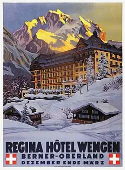 Es folgte 1929 ein weiteres bekanntes Plakat vom Hotel Regina in Wengen, mit welchem auch in England geworben wurde.