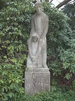 Vis-à-vis der Trauerhalle und zur Rechten des Zugangs zum Ehrenfriedhof für die deutschen Soldaten steht das Mahnmal für die Gefallenen der beiden Weltkriege. (Lage) Die auf einem ein Meter hohen Sockel aufstehende, 2,20 Meter hohe Skulptur Die Klage schuf der Bildhauer Hubert Hartmann aus Thüster Muschelkalk. Enthüllt wurde sie am 18. November 1960. Im Vordergrund eine kniende Frau, die Trauernd ihre Hände im Schoß faltet und hinter ihr stehend ein Mann, der schützend seine Hände auf ihre Schulter legt.[18]