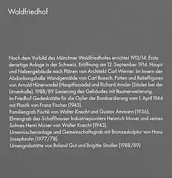 Im Waldfriedhof ist eine interessante Sammlung von Grabmalen und Plastiken aus den Werkstätten Schaffhauser und Schweizer Künstler zu finden. Von besonderer Bedeutung sind: