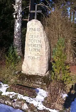 Nördlich der Kirche befindet sich ein Findling als Kriegerdenkmal für die Toten der Weltkriege. Der Findling ist mit der Inschrift 1914–18 / DEINE TOTEN WERDEN LEBEN / 1939–45 (Jes. 26,19 ) versehen und mit einem Kreuz bekrönt.
