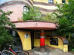 Von außen fallen die typischen Elemente des Hundertwasser-Stils auf: die goldenen Zwiebeltürme, das Fehlen von geraden Linien und Ecken, die bunte Bemalung des Gebäudes in Erdtönen und die farbenfrohen Keramiksäulen.