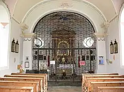 Das Chorgitter ist aus Schmiedeeisen. Die Glocke nennt 1842.