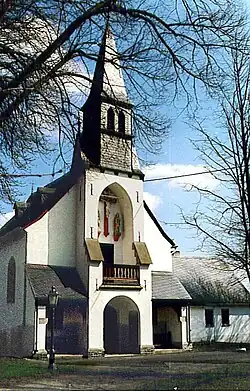 Die Kapelle ist eine Hallenkirche mit einem geschieferten Kirchturm mit drei Glocken über dem Eingang. In den Turm ist eine große Außenkanzel für Predigten integriert. Beidseitig neben dem Haupteingang sind zwei Nischen mit geschieferten Vordächern. An den Außenwänden stehen mehrere Statuen, eine Darstellung der Heiligsten Dreifaltigkeit sowie Jesus und Maria mit ihren Vorfahren. Darüber hinaus ist eine große Anzahl von meist aus Marmor bestehenden Votiv- und Danktafeln angebracht.