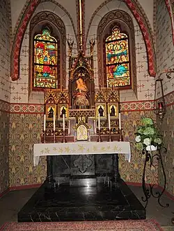 Im Chorraum steht ein Marmoraltar, auf dem in der Mitte die Gottesmutter Maria mit dem Jesuskind dargestellt ist. Die Skulptur wird flankiert von Darstellungen der vier Evangelisten. Die beiden Altarfenster zeigen rechts die Geburt Christi (Lk 2,1-7 ) und links die Darstellung Jesu im Tempel von Jerusalem (Lk 2,25-38 ).
