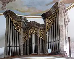 Die kleine Orgel auf der hinteren Empore über dem Eingangsbereich wurde 1768 von Johann Georg Aichgasser und Conrad Keppner für die Seminarkirche in Meersburg gebaut. 1891 wurde sie von Wilhelm Schwarz umgesetzt. 1958 wurde das Instrument von Firmennachfolger Eugen Pfaff restauriert und 1986 rekonstruiert. Es hat zehn Register auf einem Manual und Pedal.[5]