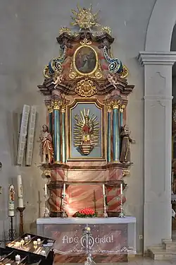 Der rechte Seitenaltar hat den gleichen Aufbau wie der linke Seitenaltar. Das Gemälde zeigt die „Taufe Jesu“ und stammt von Franz Bertle aus dem Jahr 1869. Es wird von Figuren des Erzengels Michael und des heiligen Petrus flankiert. Das Oberbild stellt die „Marterung des heiligen Sebastian“ dar.