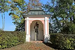 Die barocke Wegkapelle vor der Kirche und schräg gegenüber der Loretokapelle wurde um 1740 errichtet.[9] An der Schauseite eine weite Bogenöffnung mit schulterbogigen Ansätzen und schlichtem einfachen Gitter. Im Inneren eine Steinfigur des heiligen Johannes Nepomuk, ebenfalls aus der Zeit um 1740.