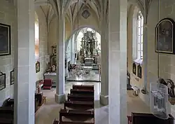 Der zweijochige Chor mit Dreiachtelschluss aus dem zweiten Viertel des 15. Jahrhunderts ist etwas niedriger und breiter als das Mittelschiff. Er wird durch ein sechsteiliges Sternrippengewölbe mit zwei skulptierten Schlusssteinen abgeschlossen, welche das Antlitz Christi und eine Rose zeigen. Das Gewölbe ruht auf flachen Wandvorlagen mit vorgesetzten Runddiensten. Die beiden mittleren Gewölberippen enden auf übereckstehenden Mauervorsprüngen mit Doppelwulstbasen und gekehlten oktogonalen Sockeln. Die anderen enden in Höhe des gegen Westen gestuften Sohlbankgesimses, das den Schluss und ein Joch umläuft.