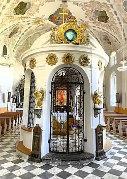 In der Längsachse des Chores steht leicht aus der Mitte gerückt im Langhaus eine Gnadenkapelle, ein Bauwerk vom Baumeister Gallus Gratl (1714). Der in der Längsachse ovale überkuppelte Bau auf Pfeilern mit Pilastervorlagen hat offene Rundbögen. Unter dem Gesimse sind barocke Medaillons mit Darstellungen der Geheimnisse des Rosenkranzes. Zwei Engel zu Seiten des Eingangs um 1760 Balthasar Horer zugeschrieben wurden 1976 gestohlen. In der Kapelle steht bekleidet als Gnadenbild eine gotische Madonna um 1400 in einem Altar von Andreas Huter (um 1870) mit den Statuen Notburga und Isidor.