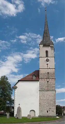 Die zwischen 1727 und 1730 im Stil des Spätbarock errichtete Kirche mit der Westmauer aus romanischer Zeit, den Seitenmauern und dem Turm aus dem 15. Jahrhundert besteht aus einem großen dreigeteilten Saal mit einer lichten Länge von 39 m, bestehend aus dem Langhaus, einem Vorchor und dem Altarraum. Auf der Westseite wird das Langhaus einjochig durch den Südwestturm und zwei Galerien abgeschlossen, der offene Teil des Langhauses erstreckt sich über vier Joche. Der sich daran nach Osten anschließende einjochige Vorchor ist im Vergleich zum Langhaus etwas schmaler und fensterlos. Der Altarraum ist ein weiteres Mal verengt und in Form einer Apsis ausgeführt mit zwei Fenstern auf jeder Seite. Die Gliederung wird innen durch Pilaster und Chorbögen und außen durch die 1974 wiederhergestellte Architekturbemalung hervorgehoben. An der Nordseite des Vorchors ist die zweigeschossige Sakristei angebaut.[30]