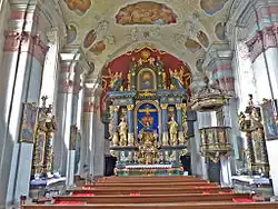 Die Altäre und die Kanzel sind im sogenannten Jesuitenstil gehalten, das heißt, dass das Holz schwarz und die Verzierungen und Statuen golden sind.