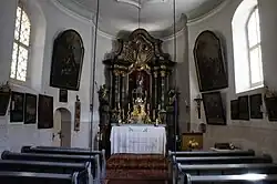 Das Kircheninnere zeigt ein Langhaus unter einer Flachdecke mit einem Stuckspiegel und einem umlaufenden Gesims mit einer Hohlkehle. Es gibt eine nördliche Empore.