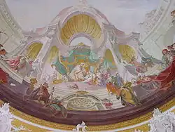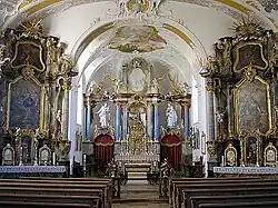 Den festlichen Innenraum schmückte Franz Xaver Schmuzer ab 1754 mit einer dezenten Stuckdekoration. Die Fresken stammen von Franz Martin Kuen. 1754 malte der Meister das Chorfresko mit Maria als Fürbitterin der Christenheit. Auf dem großen Langhausfresko von 1755 erkennt man Esther vor Ahasver. Die Kartuschen zeigen die hilfreiche Muttergottes nach den Anrufungen der Lauretanischen Litanei.
