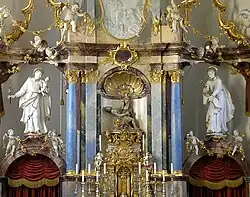 Der Hochaltar aus Stuckmarmor wurde wieder vom Franz Xaver Schmuzer unter Mitwirkung von Maximilian Grueber (Schnitzereien) und Jakob Gerstens (Antependium und Tabernakel) geschaffen. Das Gnadenbild ist eine gotische Pietà des „Weichen Stils“ (um 1430). Auf dem Stuckrelief im Auszug (Aufsatz) erscheint Christus der Maria Magdalena.