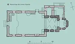 Die geostete Kirche besteht aus drei Bauteilen: Chor, Vorchor und Schiff. Der heutige Vorchor vor dem eigentlichen dreiseitig geschlossenen Chor bildete das ursprüngliche Schiff der Kapelle von 1672. Das heutige Langhaus entstand 1681 bis 1684. Gleichzeitig entstanden der Glockenturm und die Sakristei im Osten des Turms. Die Werktagskapelle an der Nordwand wurde 1948 angebaut.