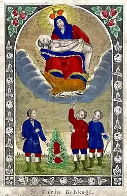 In prächtiger Höhenlage auf einem Bergrücken im Auslauf der Fischbacher Alpen südöstlich von Kapfenberg wurde nach einer Wallfahrtslegende, nachdem ein flüchtendes Reh sich in einem Baum versteckt hatte, ebendort in einer Baumhöhlung ein Vesperbild aufgefunden. Eine andere Legende berichtet von drei Bauern, welche neben einem grasenden Reh ein Vesperbild fanden. Im Jahre 1354 wurde eine Kapelle errichtet, wo ein hölzernes Gnadenbild mit einer Marienklage, mit der Darstellung eines Rehes und von drei Bauern zu Marien Füßen, zur Aufstellung kam. Die Jahreszahl 1354 an der nordwestlichen Langhauswand bezeichnet wahrscheinlich die ehemalige Lage der Kapelle.