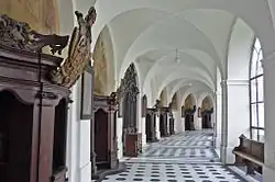 Die Kirche ist von einem Kreuzgang mit sieben Kapellen umgeben, der ursprünglich 1584 bis 1590 erbaut wurde. Von 1625 bis 1722 erfolgte der Ausbau und Umbau des Kreuzganges und der Kapellen. Der Kreuzgang hat eine elliptische Form und öffnet sich zum Innenhof hin mit Arkaden, die teilweise verglast sind.[14] Die Kapellen symbolisieren die Sieben Schmerzen Mariens und tragen die Namen der Stifter.[1]