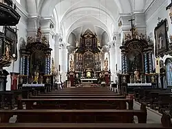 Das dreijochige Langhaus mit einem rundbogigen Triumphbogen und einem eingezogenen zweijochigen Chor mit 3/8-Schluss ist mit Kreuzgratgewölben zwischen Gurtbögen überwölbt.