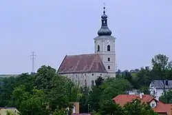 Der gotische Kirchenbau entstand in der Mitte des 15. Jahrhunderts und wurde 1710 barockisiert.