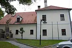 Der Pfarrhof aus dem 19. Jahrhundert neben der Kirche hat einen Laubengang.