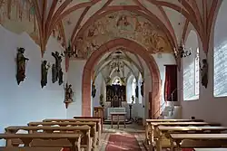 Es gibt frühgotische für die Tiroler Plastik des ausgehenden 14. Jahrhunderts entwicklungsgeschichtlich bedeutende Apostelstatuetten um 1380/1400 von der ersten 1391 genannten Kapelle, jetzt auf Konsolen an den Wänden.