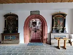 In der Vorhalle gibt es flankierend zum gotischen Portal zwei Biedermeier-Hausaltärchen, links mit dem Altarblatt Mariä Krönung mit den Heiligen Jakobus und Josef aus dem Ende des 18. Jahrhunderts, rechts ein bemerkenswertes romantisches Tafelbild der Heiligen Isidor, Wendelin, Notburga von Hans Kapferer 1850.