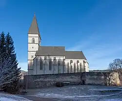Der Kirchenbau ist ein großer Quadersteinbau, der Chor ist leicht eingezogen. An Langhaus und Chor befinden sich vierfach abgetreppte Strebepfeiler. Der quadratische Westturm ist fünfgeschoßig, vorgestellt und in die Wehrmauer eingebunden. Im Erdgeschoß des Turmes befinden sich im Norden und Süden eine spitzbogige Öffnung, im Westen ein Maßwerknasenfenster. Über Konsolen erhebt sich ein Sternrippengewölbe. Die weiteren Turmgeschoße verfügen über verstäbte Fenster und Biforenschallöffnungen. Seit 1949 besitzt der Turm ein Pyramidendach. An der Nordseite des Turmes führt ein Treppenturm zur Empore.