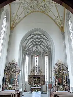 Der eingezogene Chor ist zweijochig und verfügt über einen 5/8-Schluss. Das Netzrippengewölbe erhebt sich über schlanken Runddiensten ohne Kapitelle. Die Schlusssteine zeigen Wappen und Spruchbänder, einer ist mit 1466 bezeichnet. An der Nordseite des Chores führt ein Kragsteinportal in die Sakristei. Diese verfügt über ein Sternrippengewölbe.