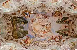 Das quergestellte Oval der Apsis mit dem monumentalen Hochaltar liegt im Osten des Kirchenschiffs als Blickfang und Zentrum der liturgischen Verehrung direkt dem Hauptportal gegenüber. Doch ist dies – mit der Orgelempore über dem Westportal – fast das einzige architektonische Zugeständnis an die West-Ost-Orientierung. Prägend sind vielmehr die mit reichem Stuckzierat und Rocailleformen geschmückten Pfeiler, die schlicht gestaltete weiße Rundbögen sowie ein üppig dekoriertes Wandgesims tragen, das sich bereits zur Kuppel rundet. Der Stuck dieses Gesimses dient gewissermaßen als Brüstung der Theaterbühne, auf der die Figuren des Deckengemäldes agieren.