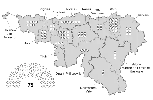 Die 75 Abgeordneten des wallonischen Parlaments wurden in 13 Wahlkreisen gewählt, die sich auf die fünf wallonischen Provinzen verteilten. Im Vergleich zur Wahl 1995 blieben die Abgeordneten pro Wahlkreis unverändert.[6]
