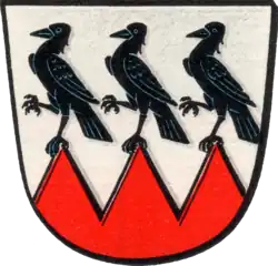 Das Wappen zeigt in Silber aus dem Schildfuß wachsend einen dreigezackten roten Wall, besetzt mit drei schwarzen Raben.