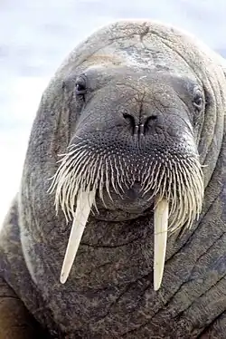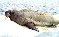 Das Walross (Odobenus rosmarus; frühere Synonyme: Trichechus rosmarus und Rosmarus arcticus[1]) ist eine Robbenart, die in den kalten Meeren der Nordhalbkugel vorkommt. Zwei Unterarten, das Atlantische (O. r. rosmarus) und das etwas größere Pazifische Walross (O. r. divergens), werden unterschieden. Das Walross gehört zur Ordnung der Raubtiere und ist die einzige Art in der Familie der Walrosse (Odobenidae).
