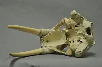 Während Jungtiere zunächst noch eine vollständige Bezahnung haben, fallen ihre unteren Schneidezähne aus, sobald die beiden Stoßzähne durchbrechen; die hinter den 3 bis 4 Vormahlzähnen gelegenen Backenzähne sind ohnehin verkümmert. Die Gesamtzahl der Zähne variiert zwischen 18 und 24 und kann durch die Zahnformel 1–2/0 1/1 3–4/3–4 0/0 ausgedrückt werden.